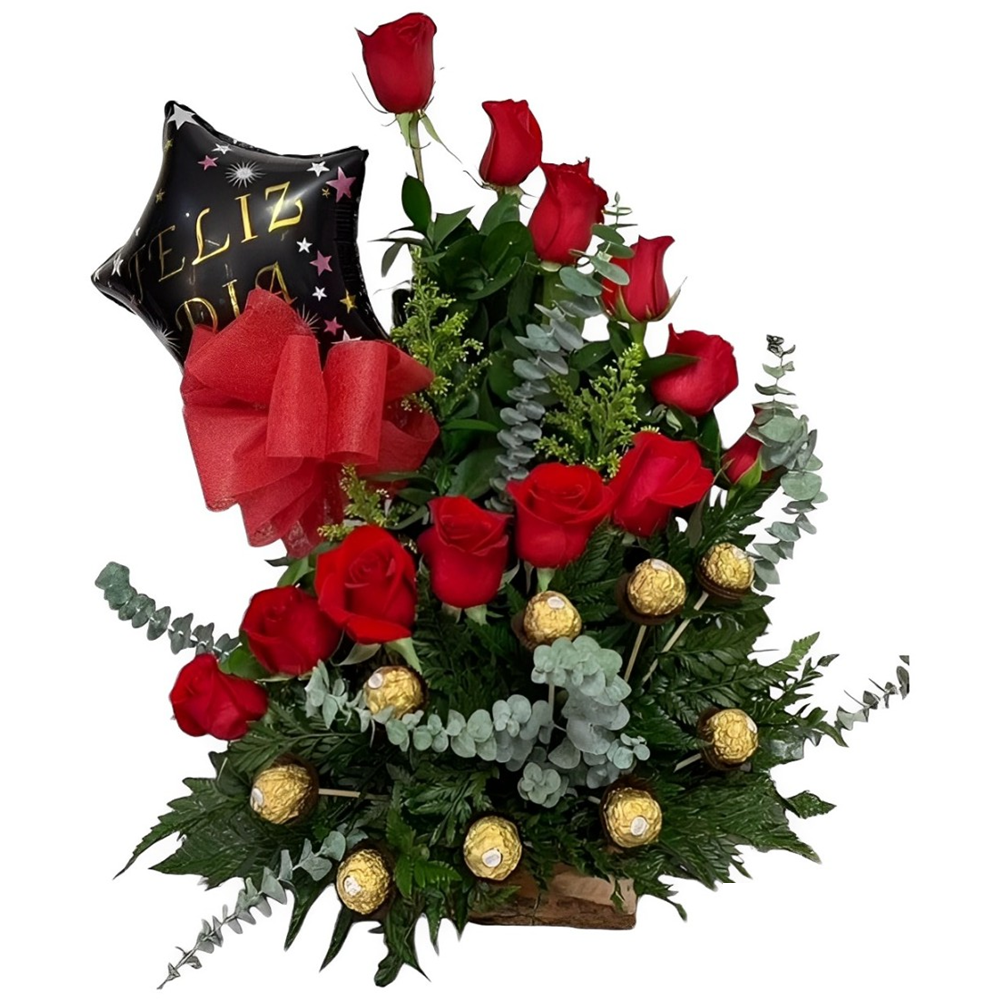 Base de madera con 12 rosas, 8 chocolates Ferrero, follaje variado y globo para la ocasión que desee