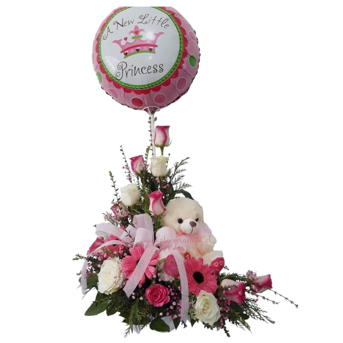 12 rosas y 3 gerberas con follaje variado, en base de madera con peluche de 20 cm y globo