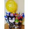 Canasta de mimbre con frutas, variedad de frutos secos, vino, mermelada, mantequilla de maní y queso holandés