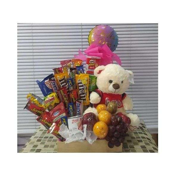 Variedad de dulces, chocolates, pasabocas, frutas, peluche de 20 cm, globo y bandeja de madera