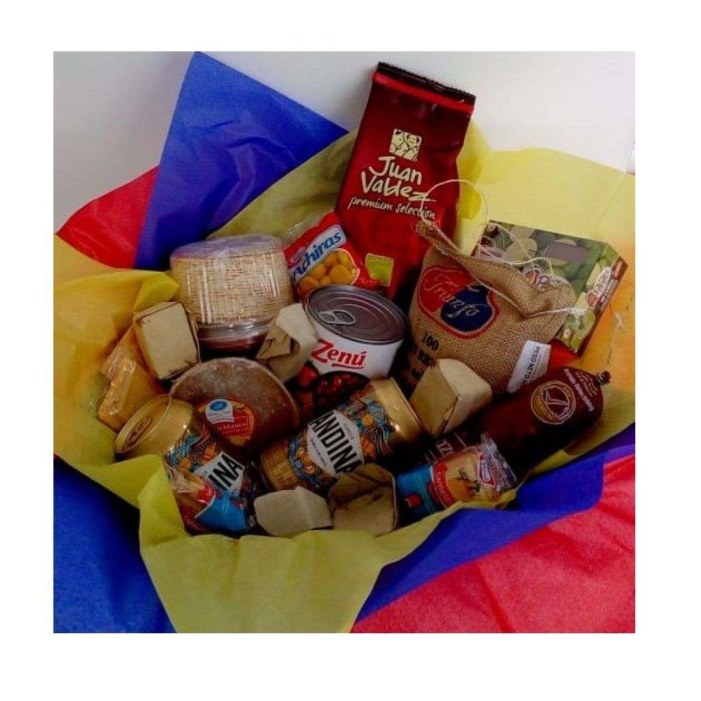 Ancheta de dulces típicos (arequipe, obleas, bocadillo, herpos, dulces de café), galletas, cerveza, café, achiras, salchichón y lata de fríjoles