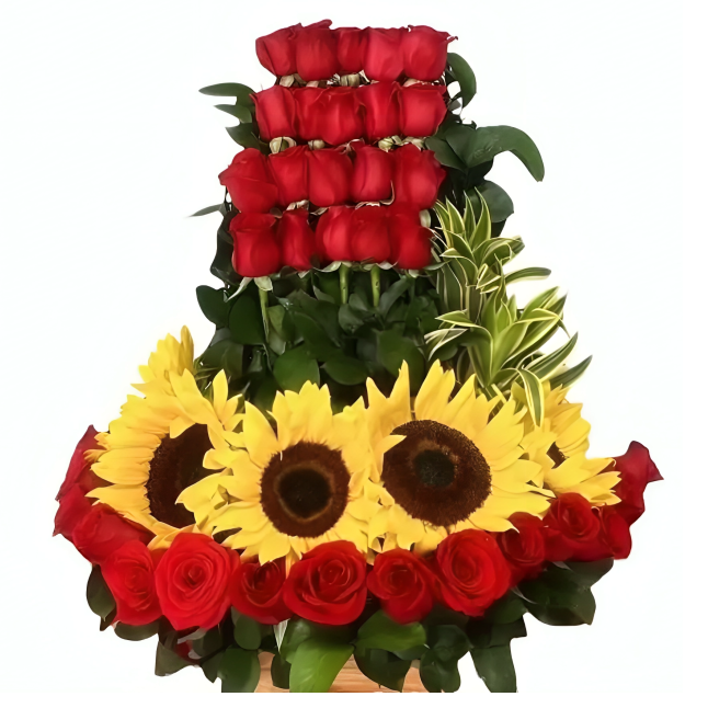 Diseño de 36 rosas de su color favorito, acompañadas de 5 girasoles y follajes variados en base de madera