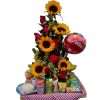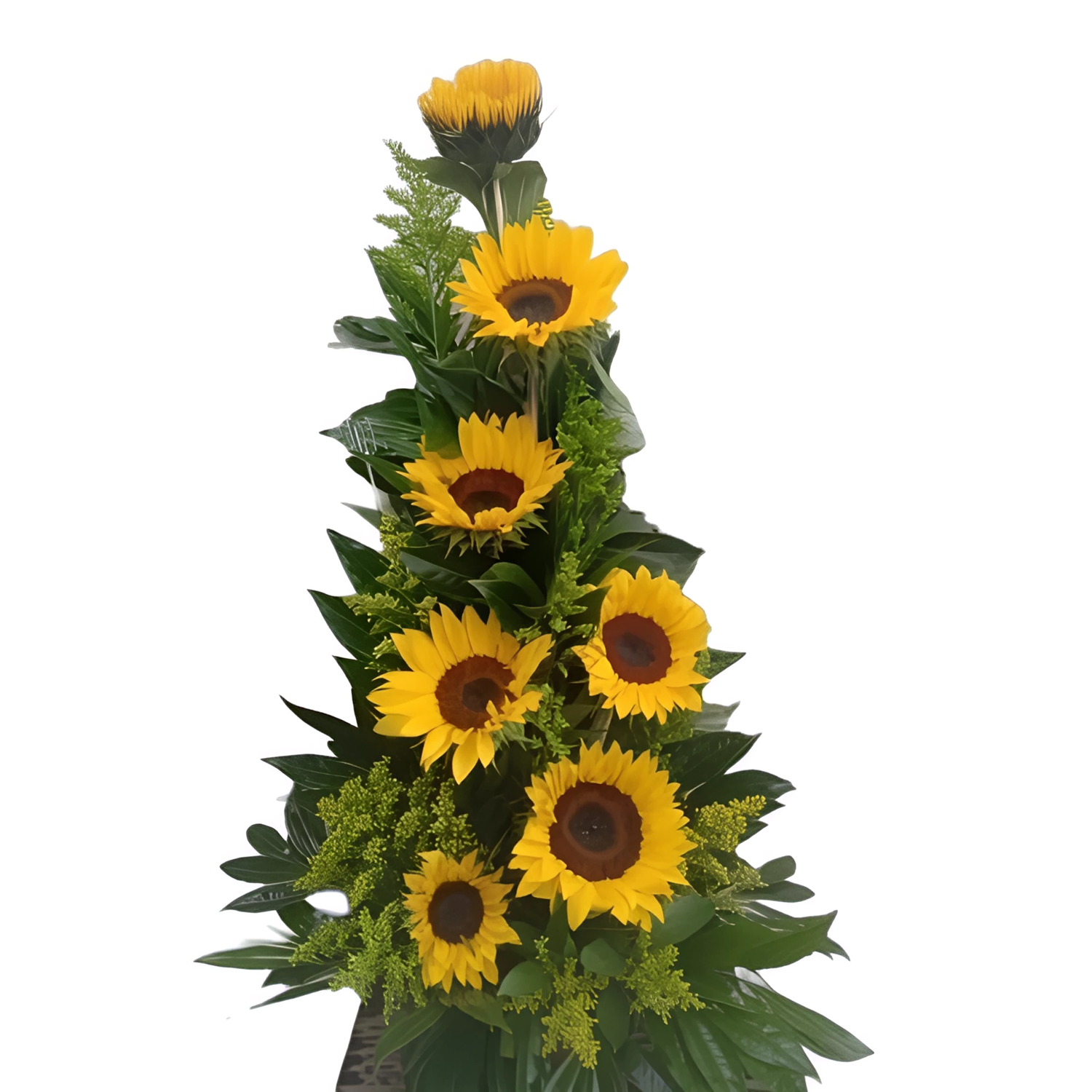 Ikebana de 7 girasoles y follajes variados en base de madera