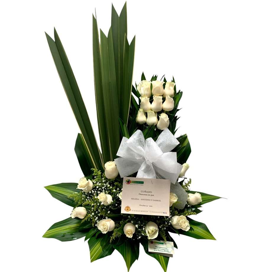 Diseño escalonado especial de 24 rosas blancas con follaje variado, moño y tarjeta, en base de madera