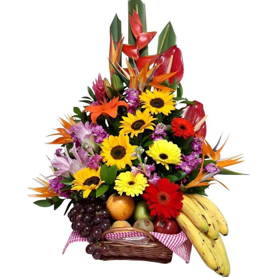 Colorido surtido de flor exótica y follajes variados en canasta con melón entero, racimo de 6 bananos, racimo mediano de uvas y 8 frutas enteras personales
