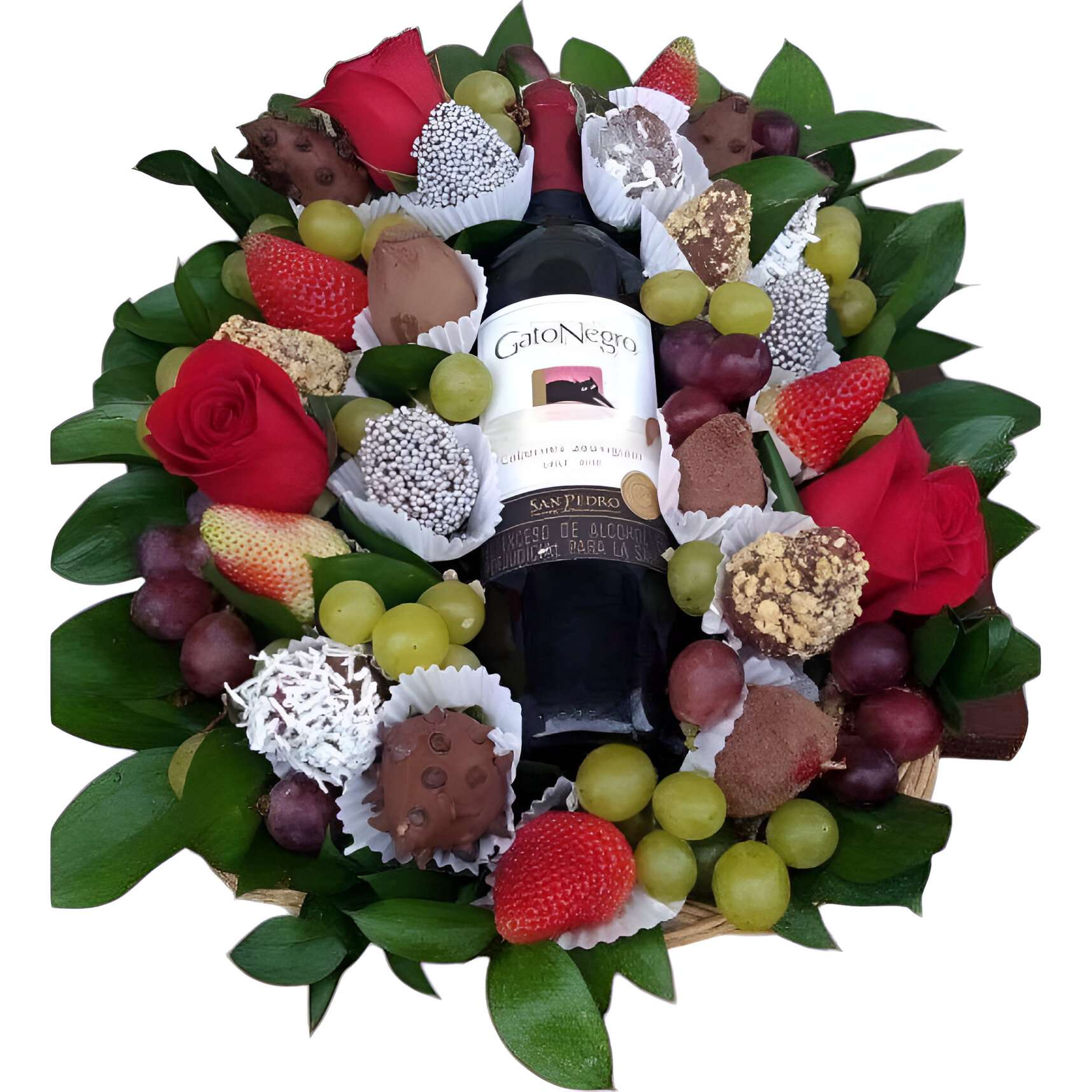 Canasta con rosas, fresas naturales y achocolatadas, uvas y vino Gato Negro
