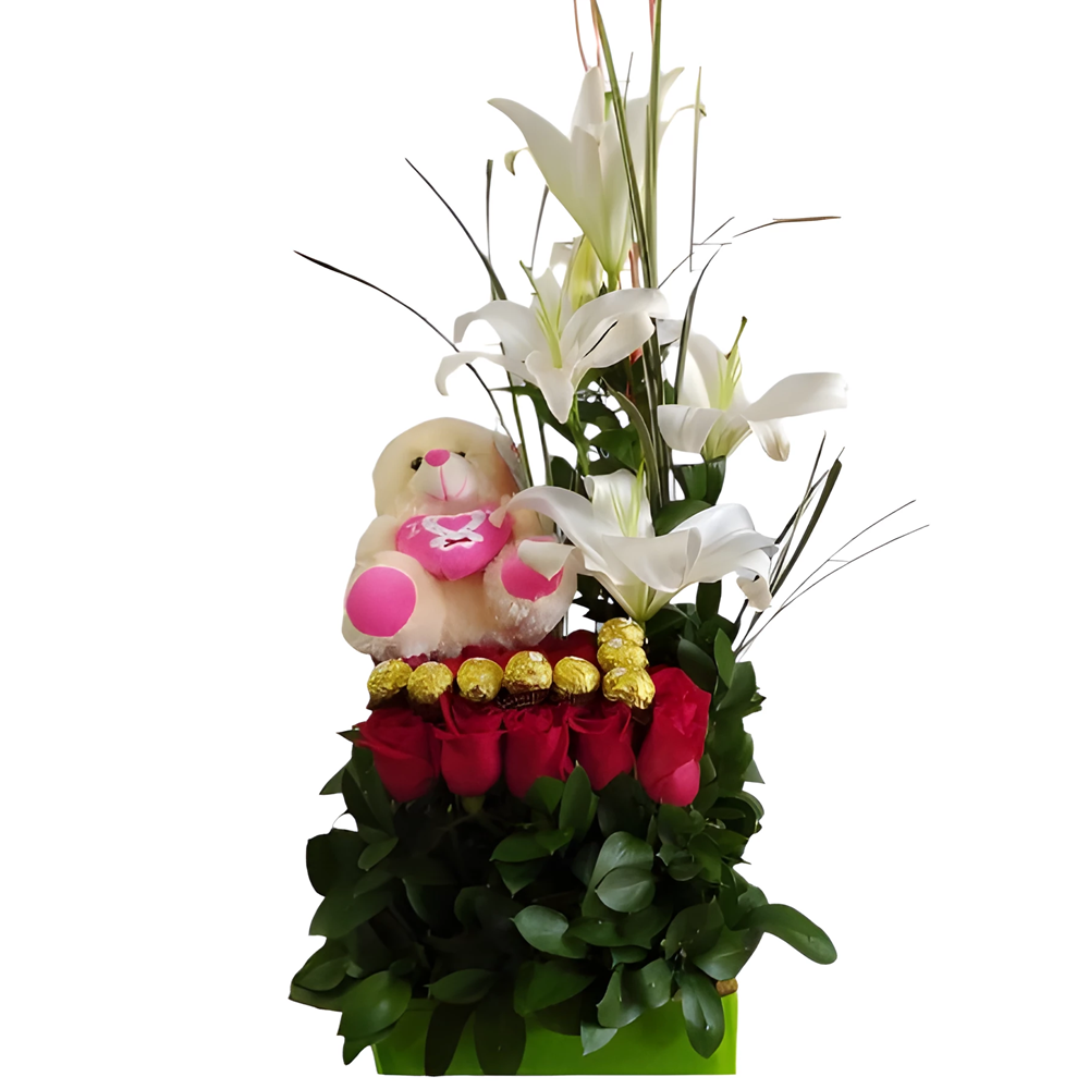 18 rosas de tu color favorito en base de madera con lirios, peluche y Ferrero Rocher x8 en estuche