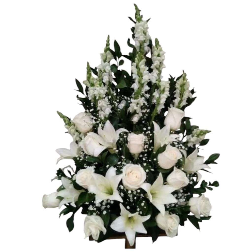Arreglo de rosas, lirios y bocas de dragón en color blanco en base de madera