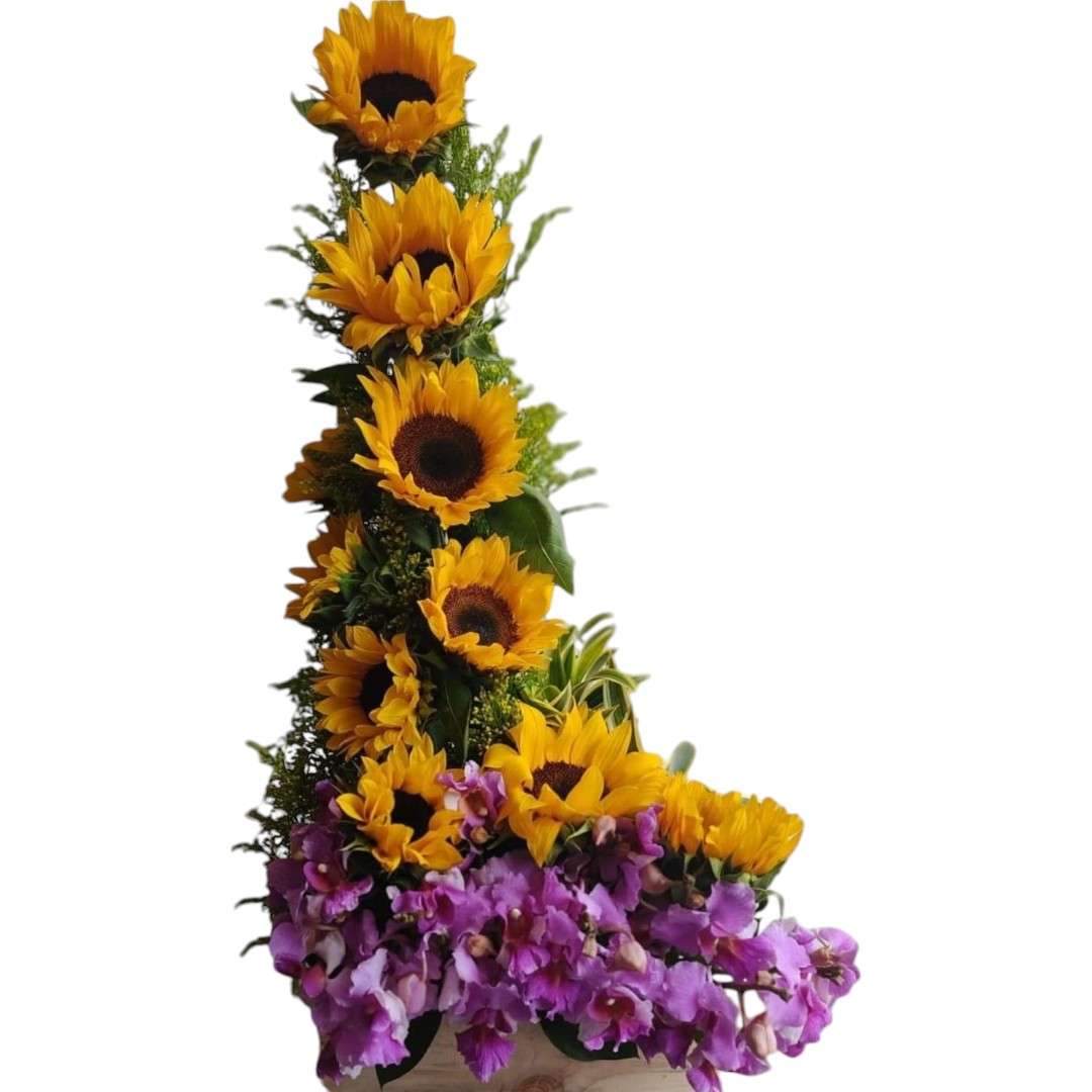 Base de madera con orquídeas hawaianas y 10 girasoles y follajes variados