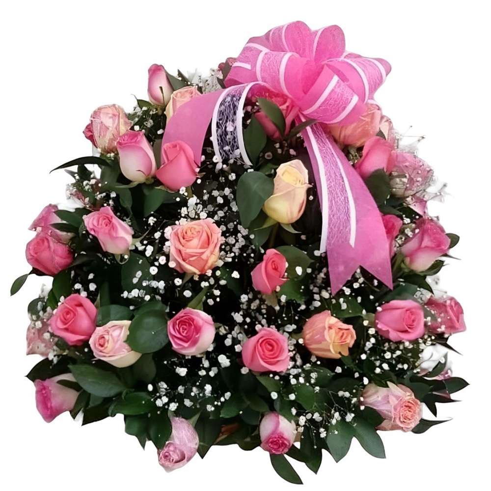 Hermoso arreglo redondo de 50 rosas del color de su elección con moño decorativo