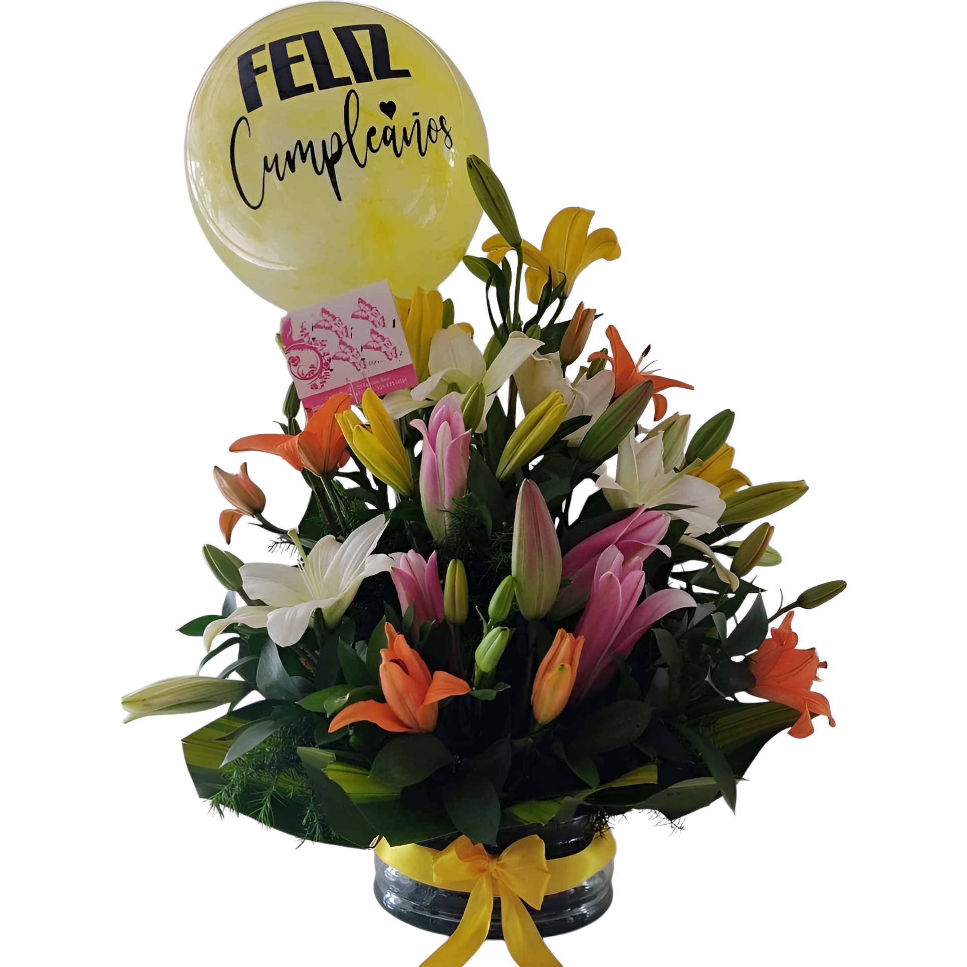 18 varas de lirios de los tonos que desee con follajes variados, en base de vidrio con moño y globo