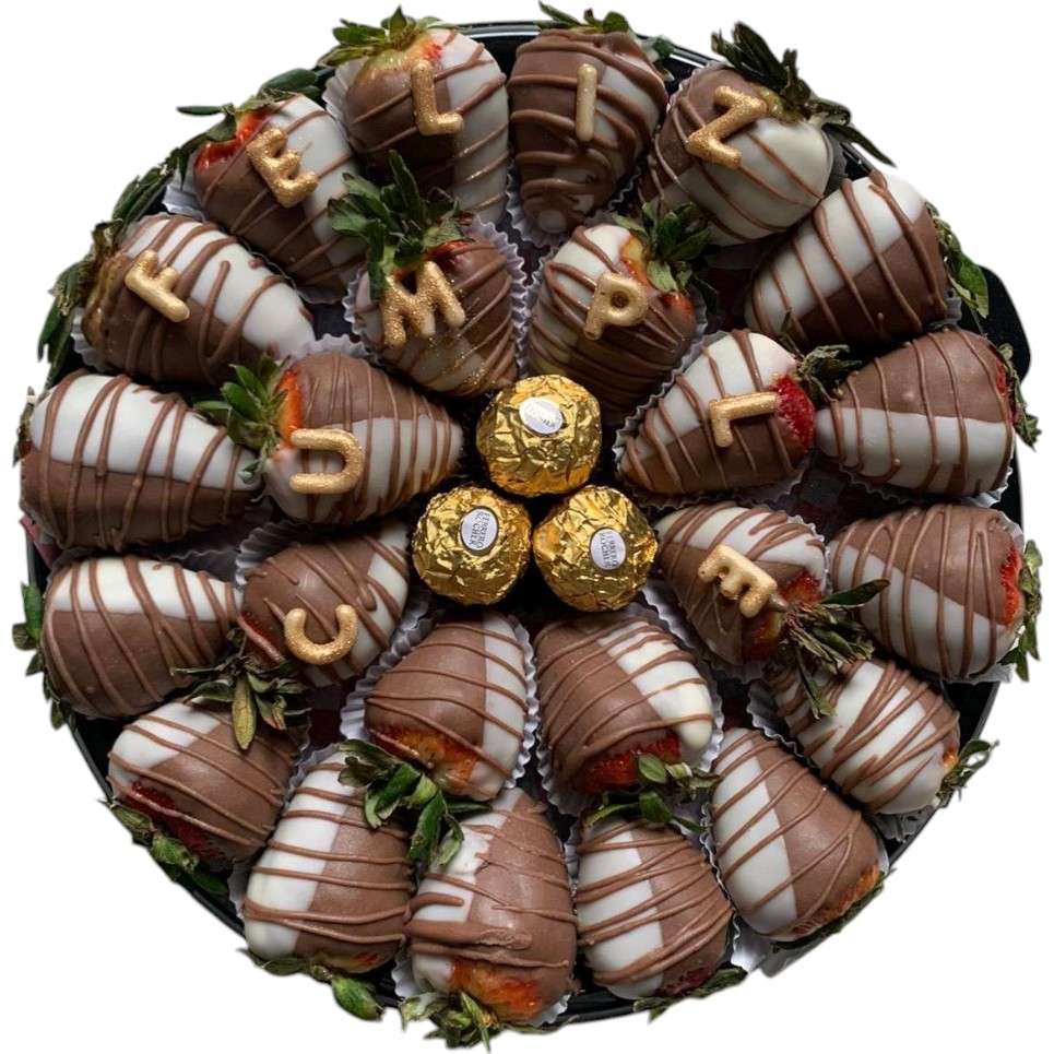 Bandeja de 24 fresas cubiertas con chocolate, 3 chocolates ferrero rocher, decoradas con mensaje para la ocasión que desee