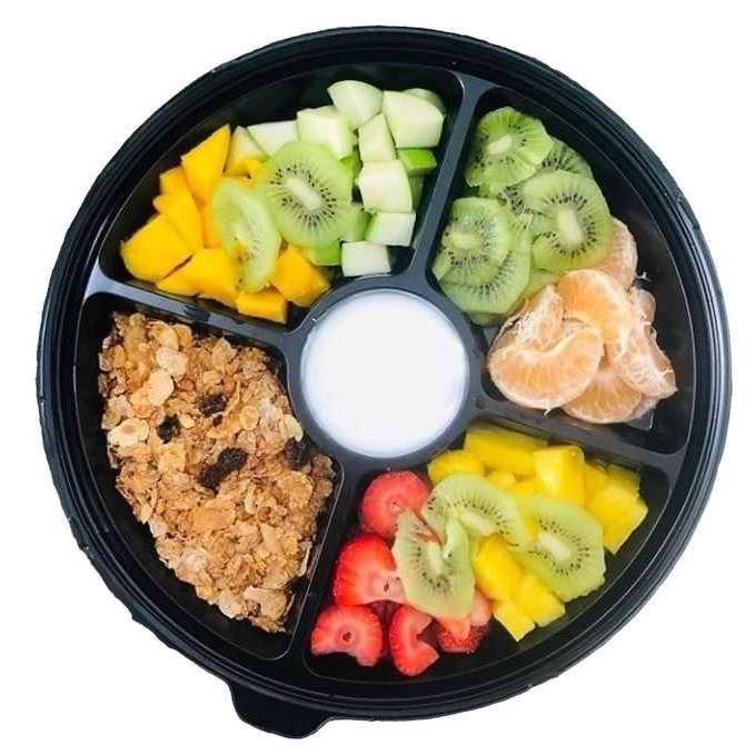 Bandeja de granola y fruta picada surtida y fresca, acompañada de moño y tarjeta