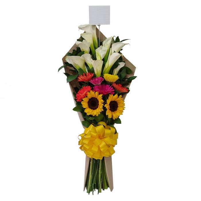 10 cartuchos, 6 gerberas y 2 girasoles, con follajes variados, tarjeta, papel y moño decorativo