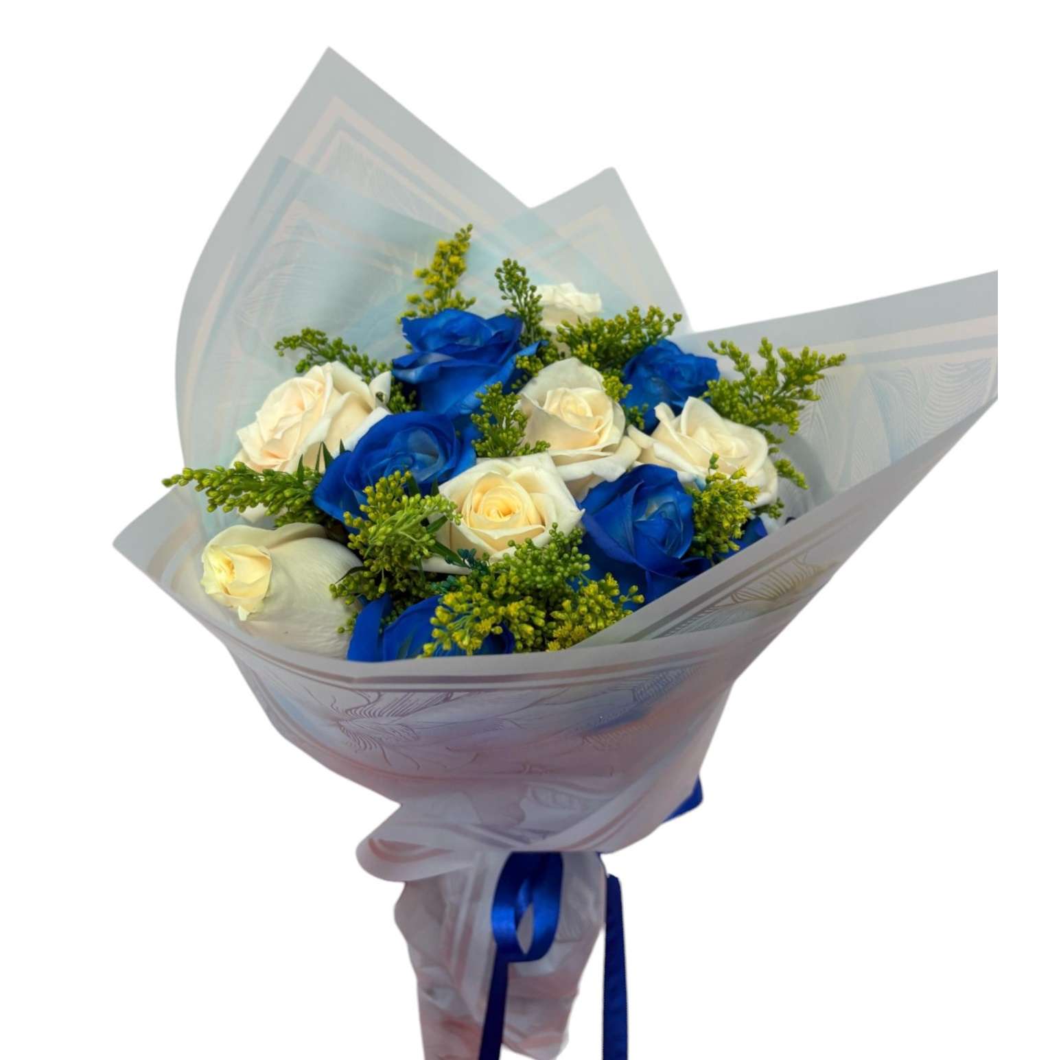 Bouquet de 12 rosas combinadas entre blancas y azules, con follaje, papel, tarjeta y moño