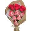 Bouquet de 3 girasoles y 6 fresas con chocolate, con papel y moño