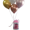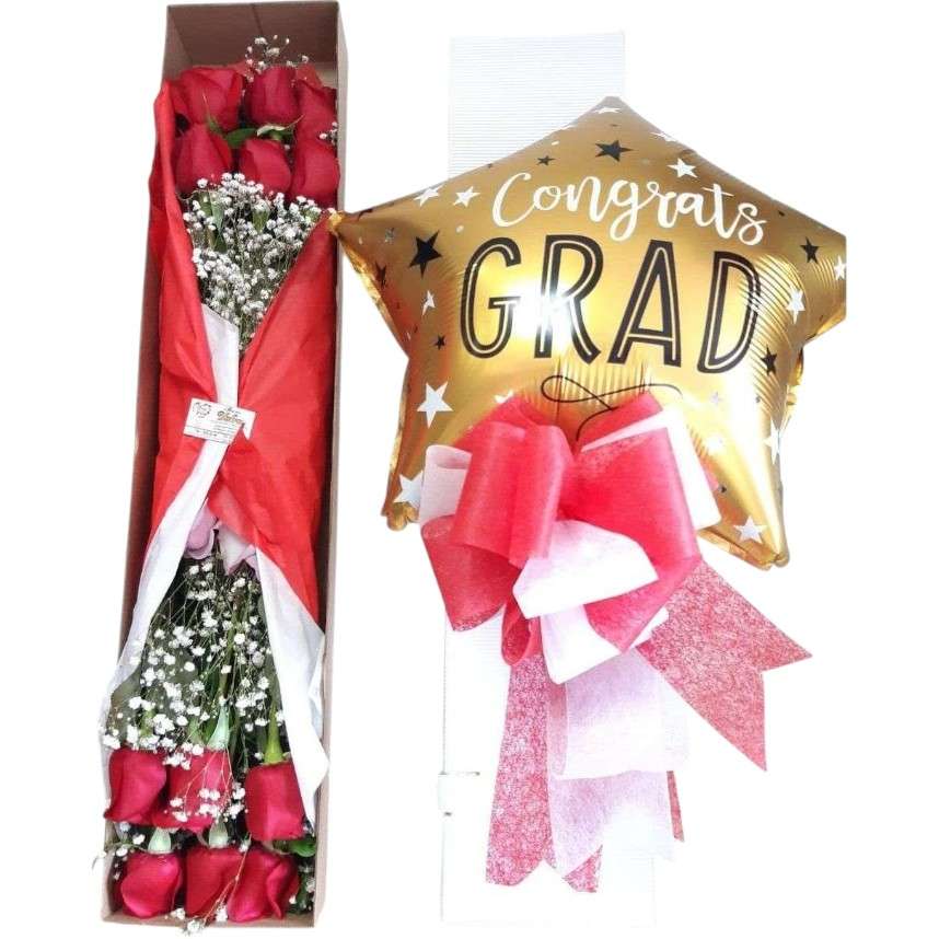Caja artesanal con diferente cantidad de rosas y globo metalizado de 9 pulgadas con motivo de grado. Precio varía según la cantidad de flores que elija.