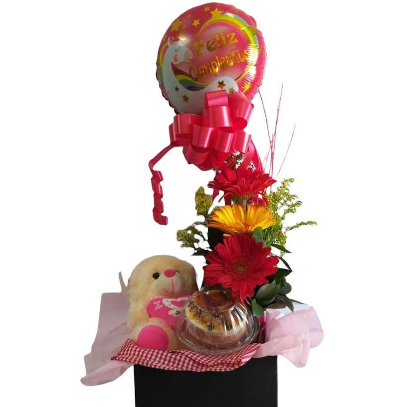 Caja de madera con peluche de 20 cm, globo metalizado para la ocasión, mug con flores y torta personal