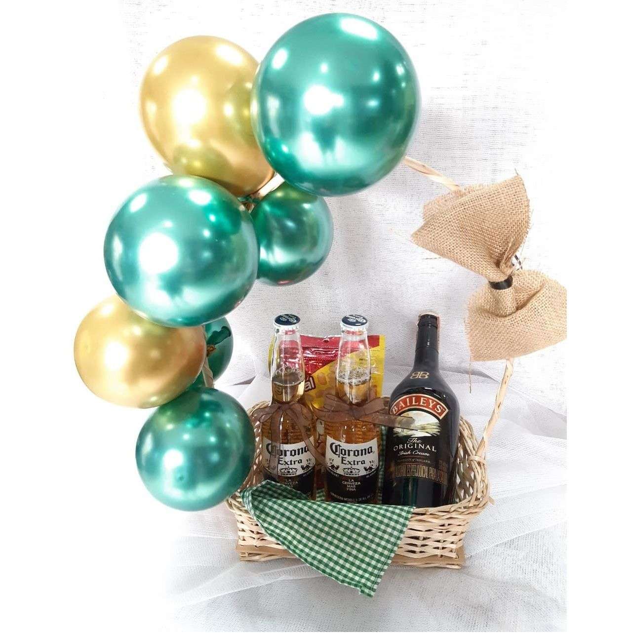 Canasta de mimbre con mantel de cuadros, con dos cervezas corona, maní doy pack y botella de 750 ml de crema de whiskey Baileys y decoración con globos