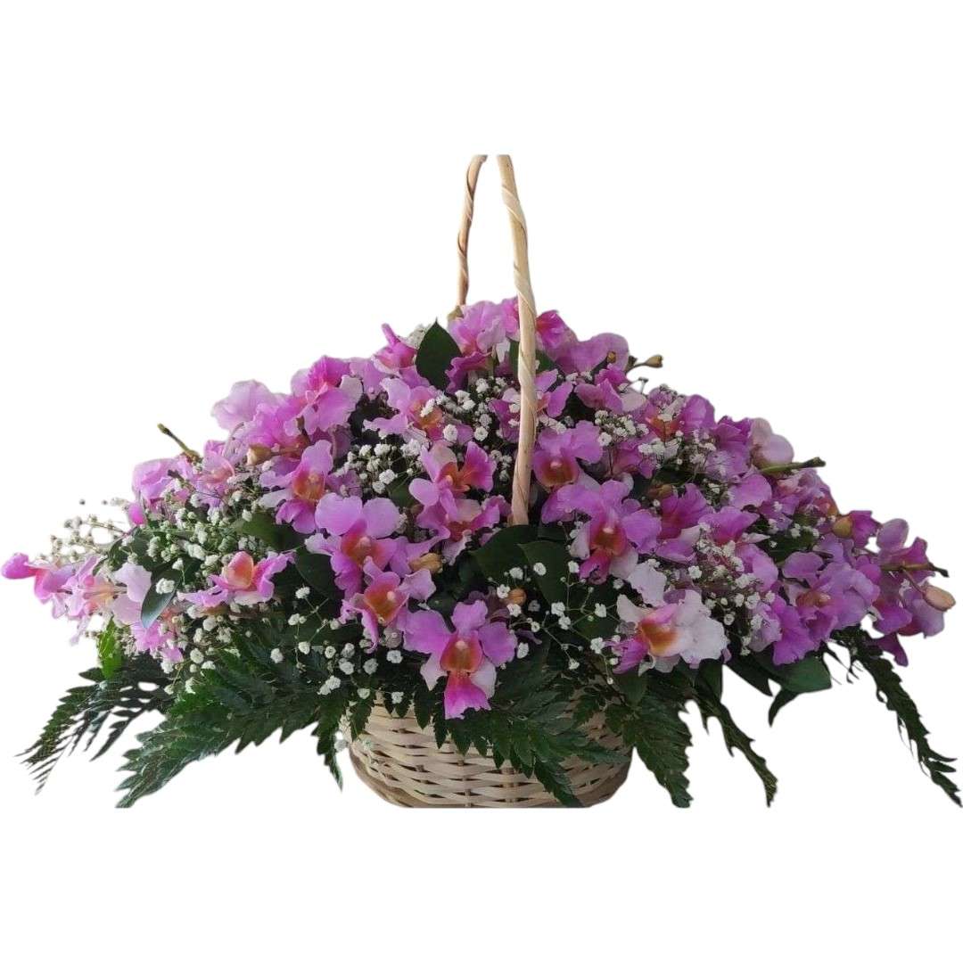 Canasta de mimbre redonda de orquídeas hawaianas con follajes variados, con moño y tarjeta