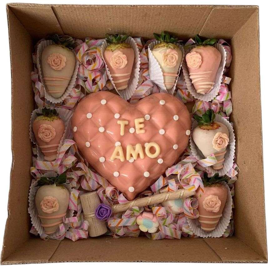Hermoso corazón de chocolate tipo piñata, relleno de deliciosos dulces entre chocolates, gomas y masmelos, acompañado de 8 fresas con chocolate. Se entrega con martillo, tarjeta personalizada, moño y caja con ventana en acetato. Elige el mensaje en letras de chocolate