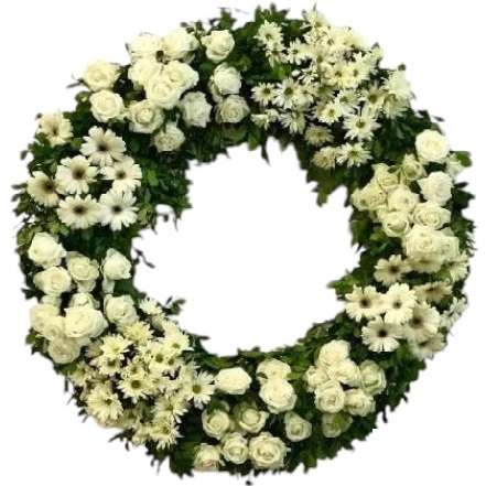 Corona fúnebre en rosas, margaritas y pompones, incluye soporte, cinta y/o tarjeta