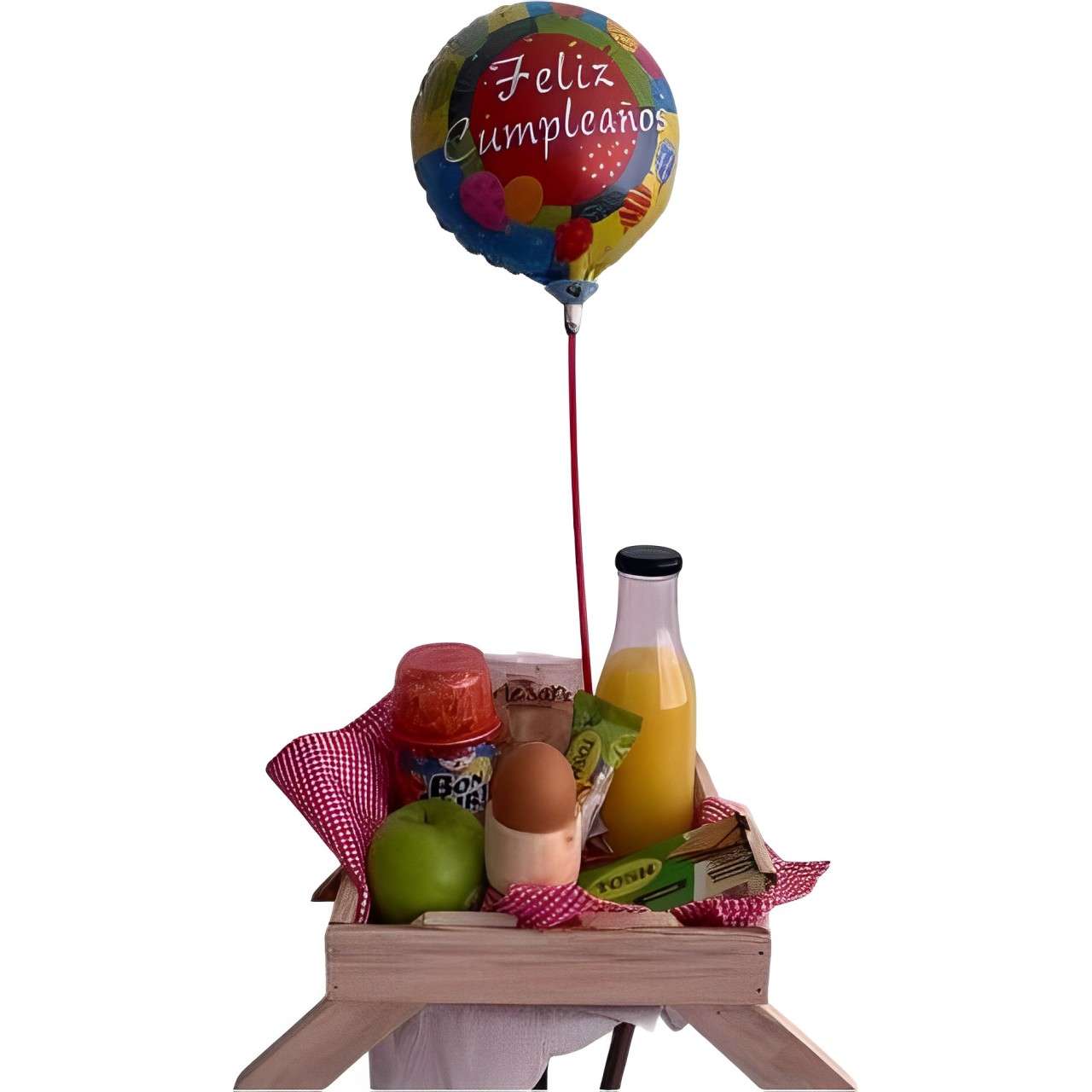 Jugo en botella de vidrio, pan personal, barra de cereales, galletas, huevo cocinado, manzana y bon yurt en mini mesa de desayuno, con globo con helio y globo metalizado