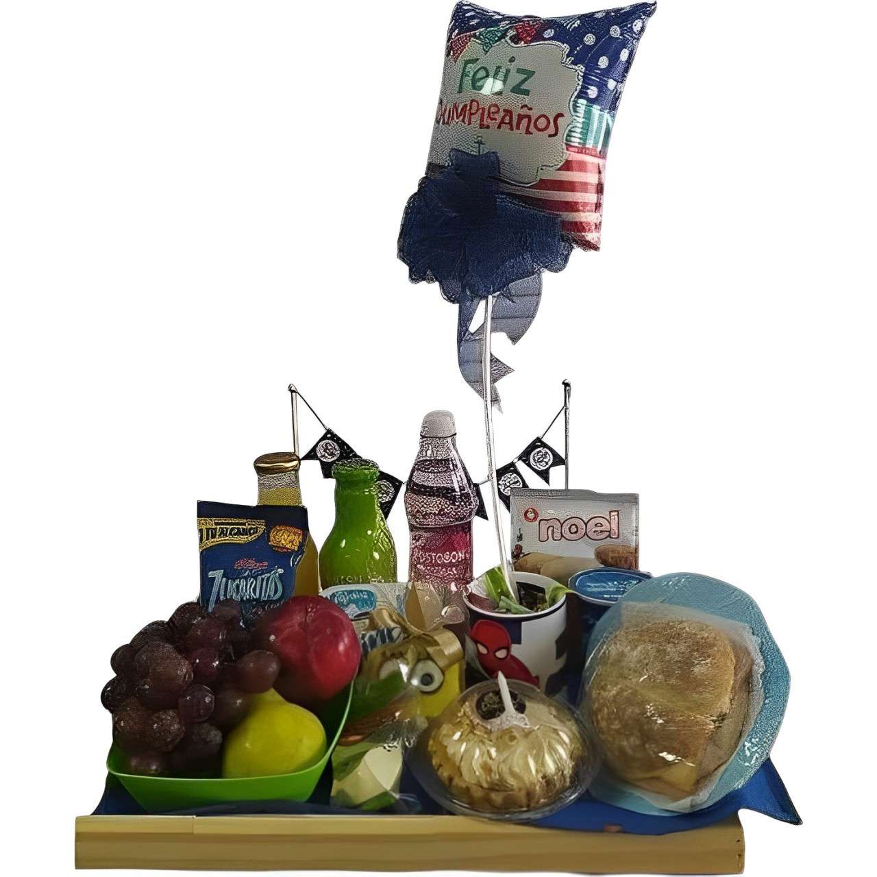 Bandeja de madera con cupcake con vela, muffin, galletas variadas, yogur, te hatsu , cereales, jugo, agua, mug , frutas, queso, sándwich y globo