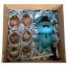 Globo burbuja, porción de jamón y queso, porción de fruta picada, botella de jugo de naranja y de leche, galletas, 3 frutas enteras personales, sándwich y pocillo, en caja de madera con tarjeta y moño
