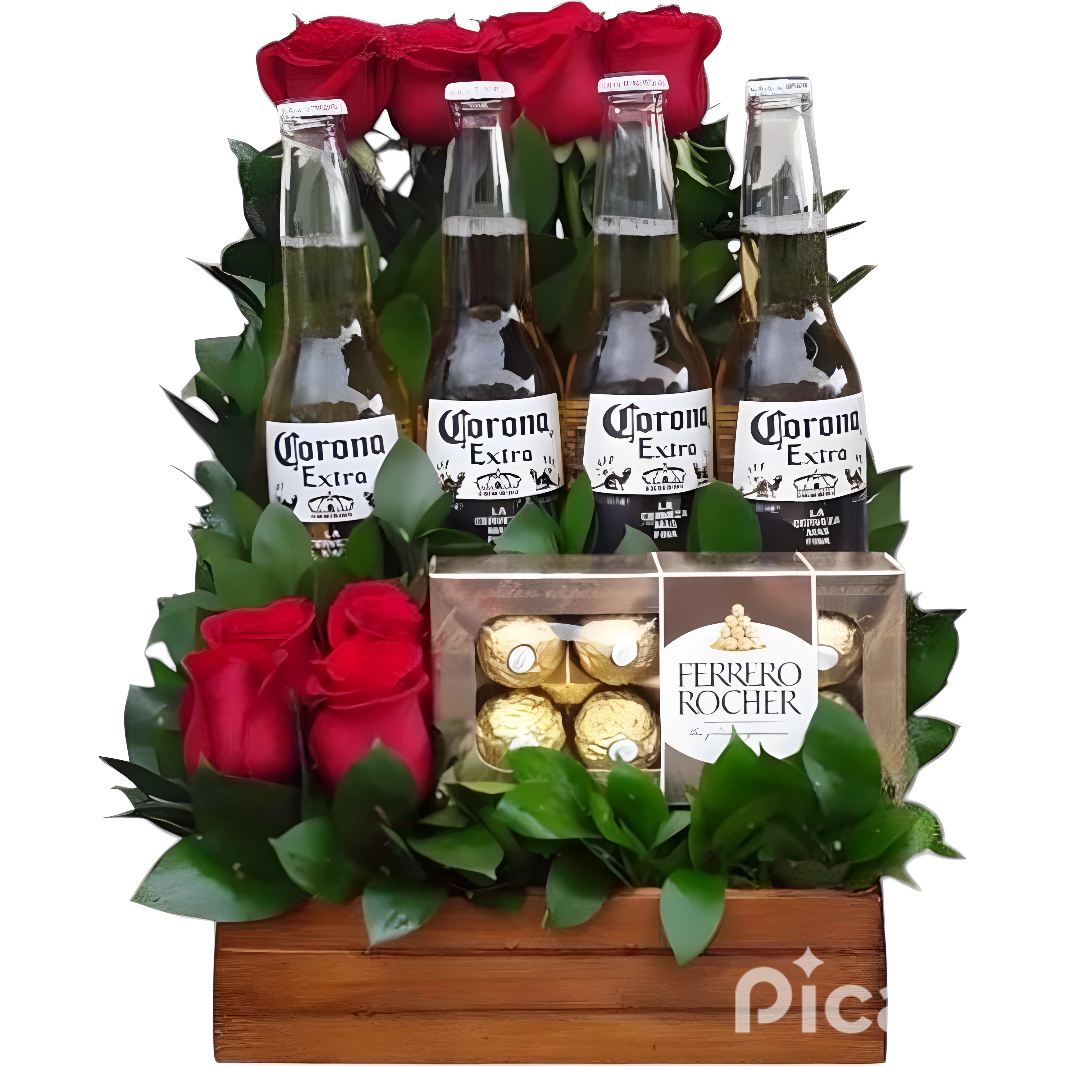 Diseño escalonado de 12 rosas, 4 cervezas corona y caja de Ferrero Rocher x 8 unidades