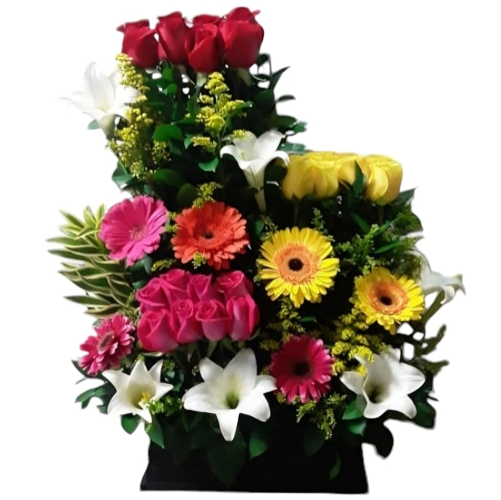 Hermoso diseño con 2 docenas de Rosas y Lirios del Japón en base de madera.
