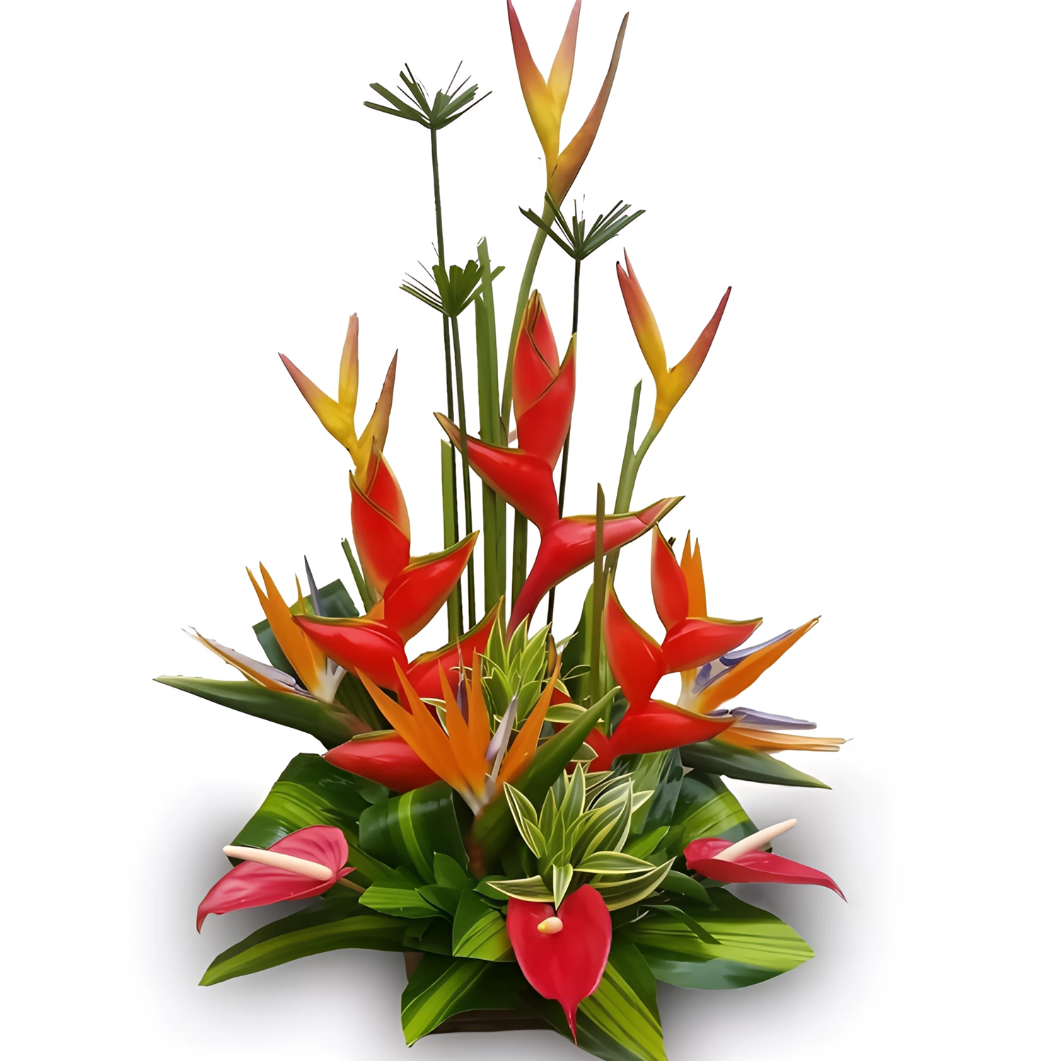 Ikebana de heliconias variadas y anturios, con follajes verdes en base de madera