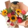 24 rosas escalonadas con gerberas y follaje variado, en base de madera con peluche de 25 cm y apliques de grado