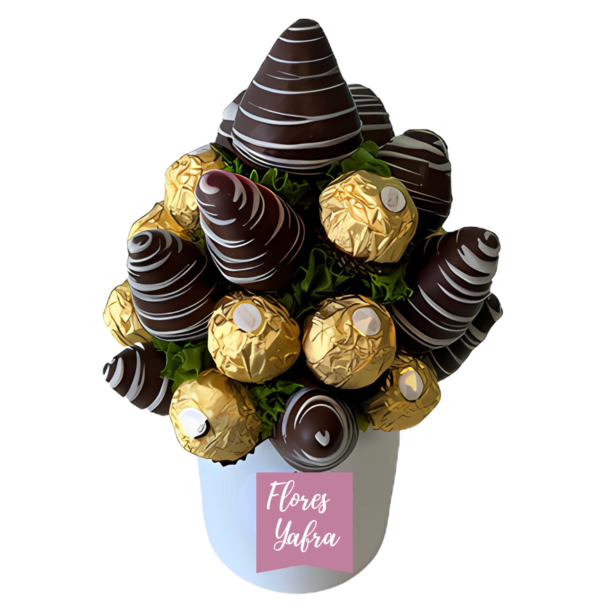 15 fresas con chocolate y 15 Ferrero Rocher en base decorativa
