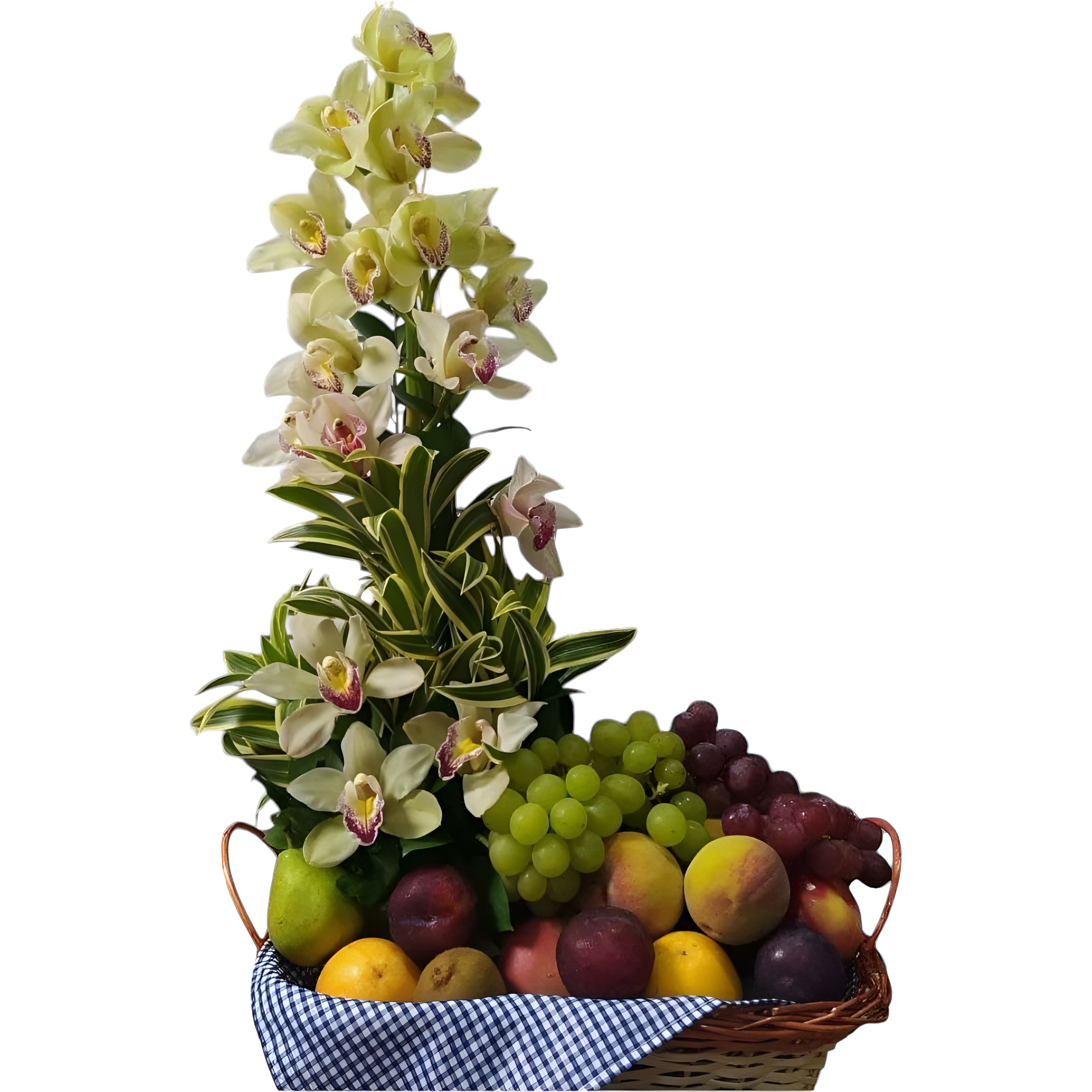 Canasta de frutas surtidas (2 racimos de uva medianos y 15 frutas enteras personales) con arreglo floral de orquídeas cimbidium de larga duración