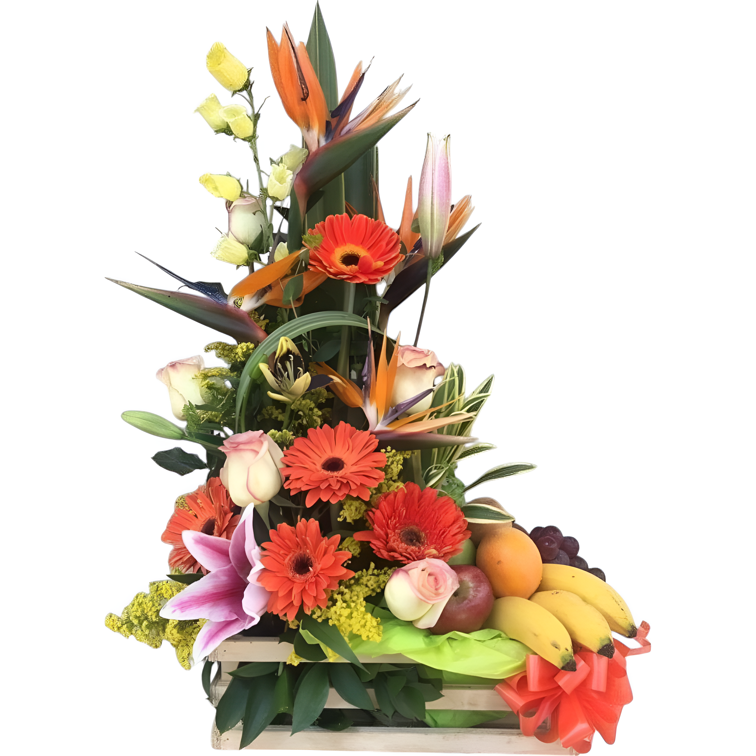 Rosas, gerberas y lirios en base de madera con 7 frutas enteras personales, 3 bananos y racimo pequeño de uvas