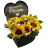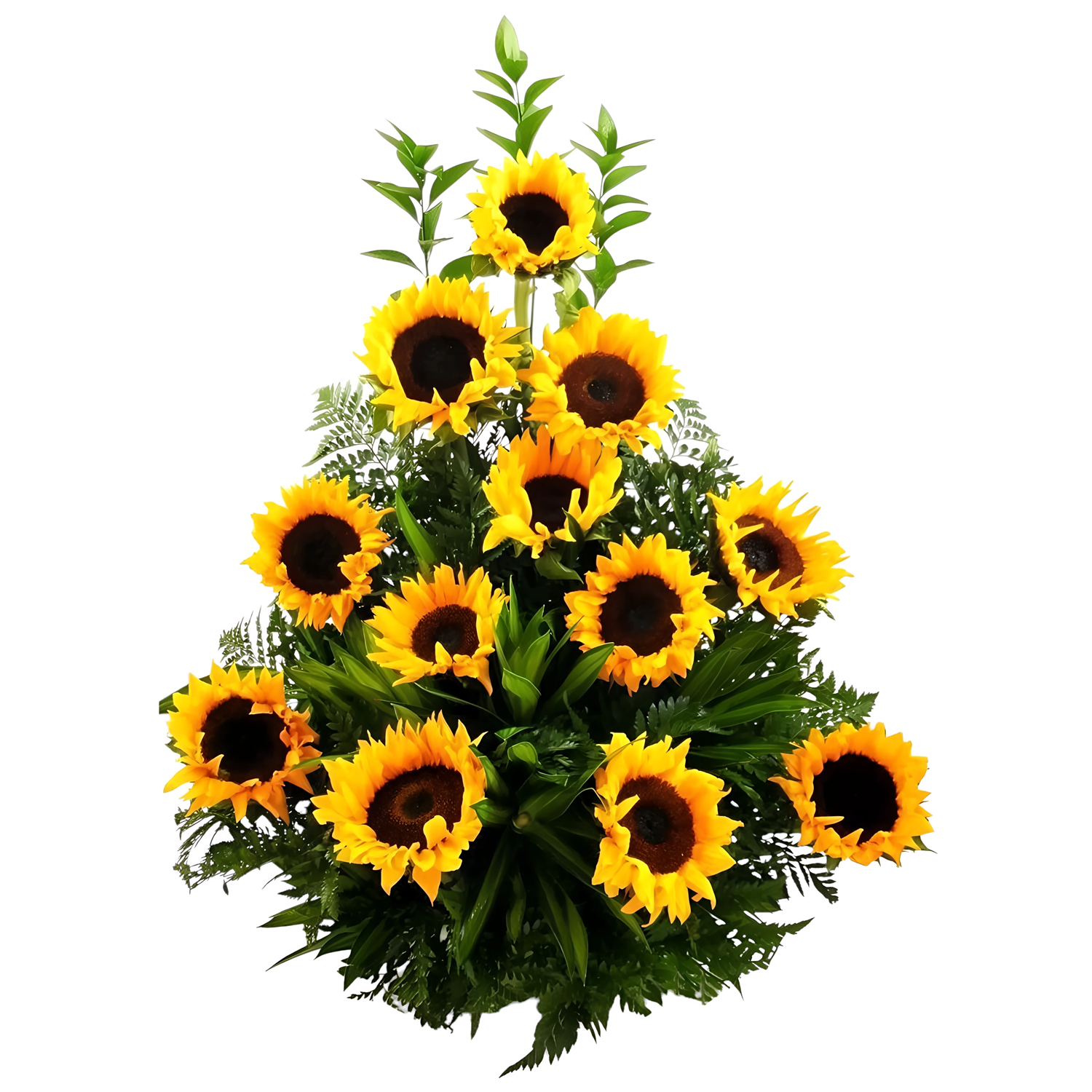 Arreglo tradicional de 12 girasoles con follajes variados, en base de madera