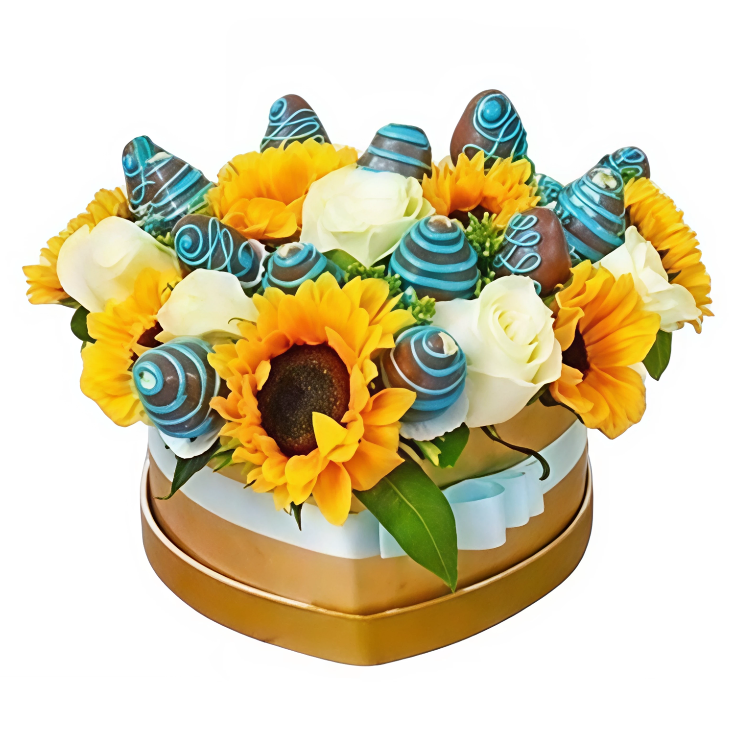 Tapizado de girasoles, rosas y fresas con chocolate, follaje variado, moño y tarjeta, todo en caja decorativa