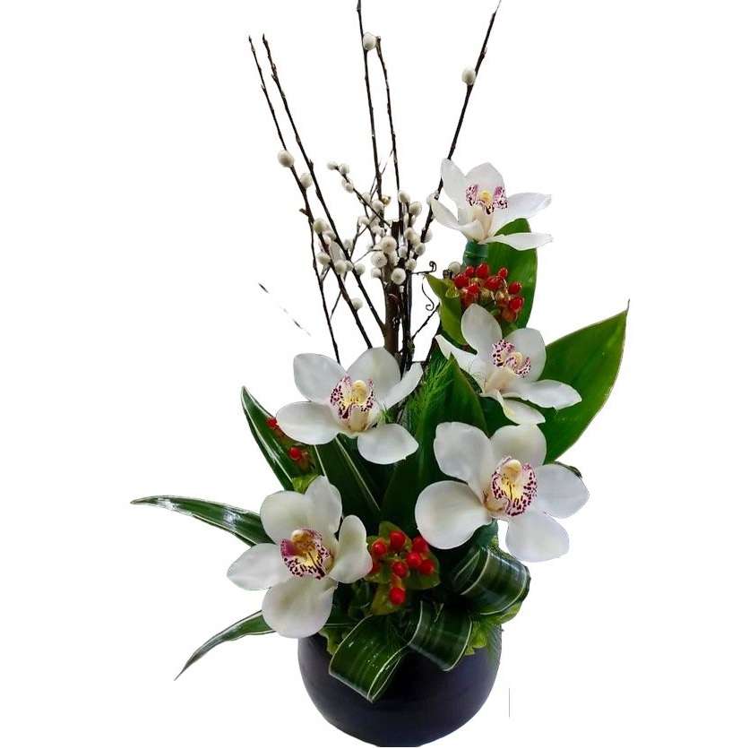 5 orquídeas cimbidium en base de vidrio con follajes verdes variados y chamizos