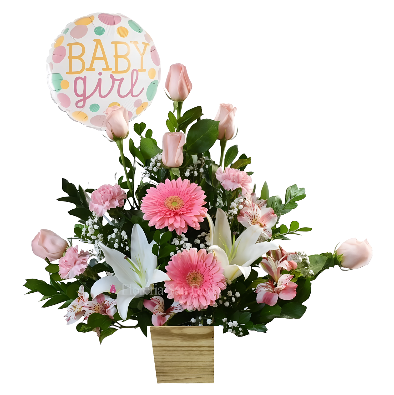 Ikebana de rosas, gerberas y lirios, con follaje variado, en base de madera con globo para bebé