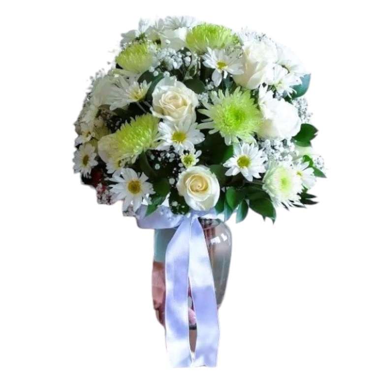 Jarrón de vidrio con surtido de rosas, margaritas y cremones, follaje variado, moño y tarjeta
