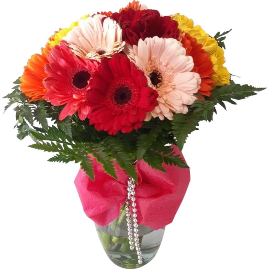 Jarrón de vidrio acompañado de gerberas de colores surtidos y follaje verde