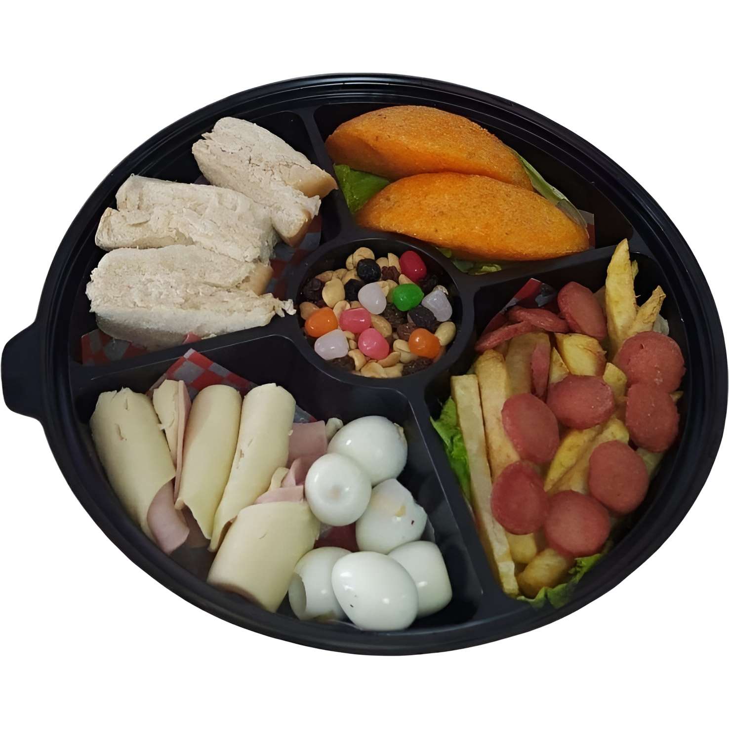 Reunión de sándwich de pollo, huevos de codorniz, rollitos de jamón y queso, empanadas frescas, salchipapa y gomitas de postre, en bandeja decorada con papel celofán y globos con helio