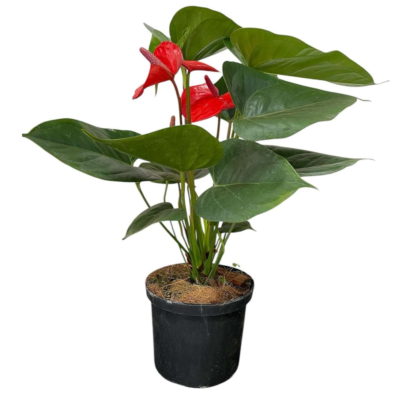 Hermosa planta de anturio rojo, en matera plástica, se entrega con papel decorativo, moño y tarjeta