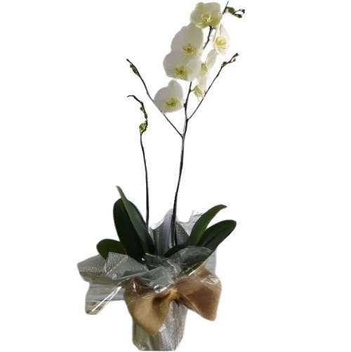 Sobria planta de orquídea del color de su elección de una vara de flores con papel, cinta de moño y tarjeta
