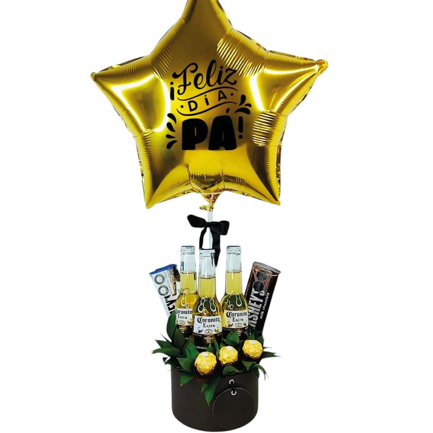Caja cilindro con 3 cervezas Corona, 3 Ferrero Rocher, 2 chocolatinas Hersheys y globo de 18 pulgadas con mensaje
