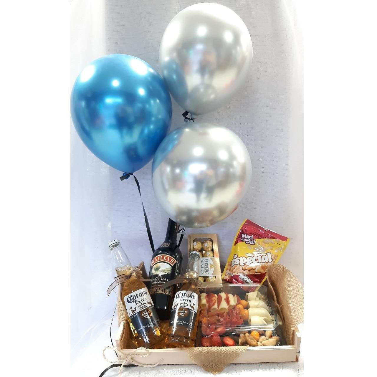 Botella de crema de whiskey Baileys de 375 ml, 2 cervezas Corona, tabla de quesos y carnes maduradas, caja de Ferrero Rocher x 8 y maní, todo reunido en bandeja de madera y globos con helio