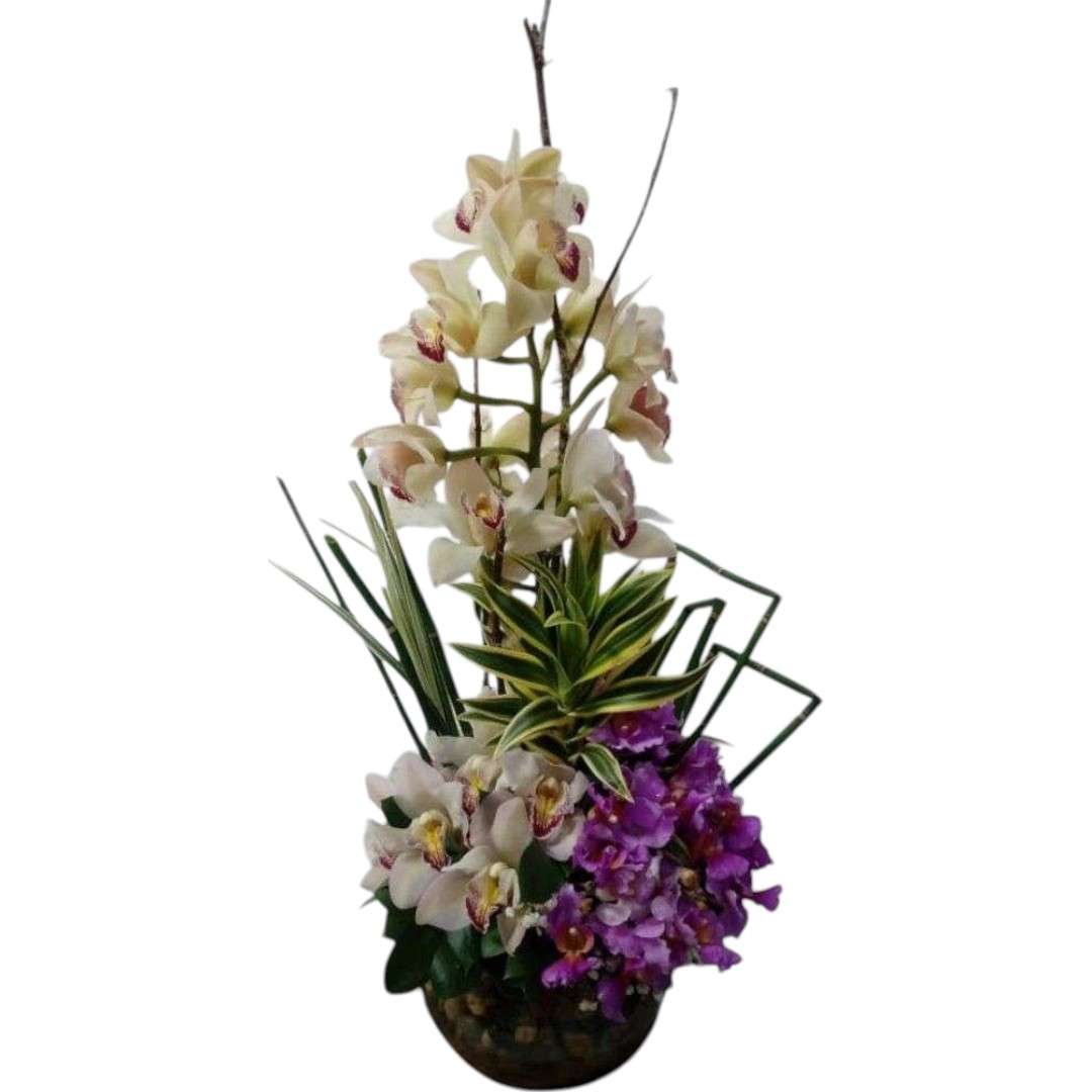 Reunión de orquídeas cimbidium y hawaianas, chamizos y follaje verde en base de madera