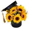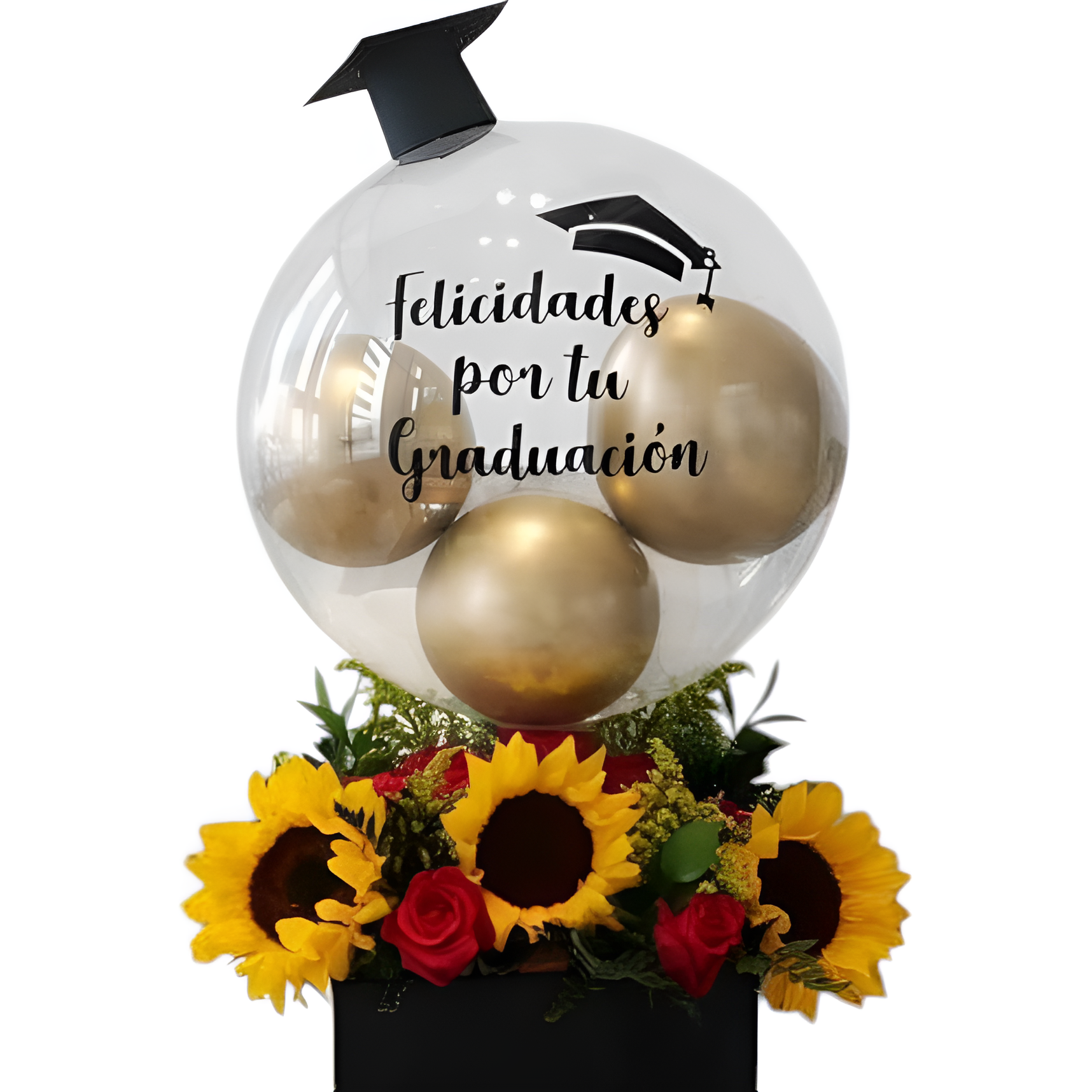 12 rosas y 4 girasoles en base de madera con follaje variado y globo burbuja