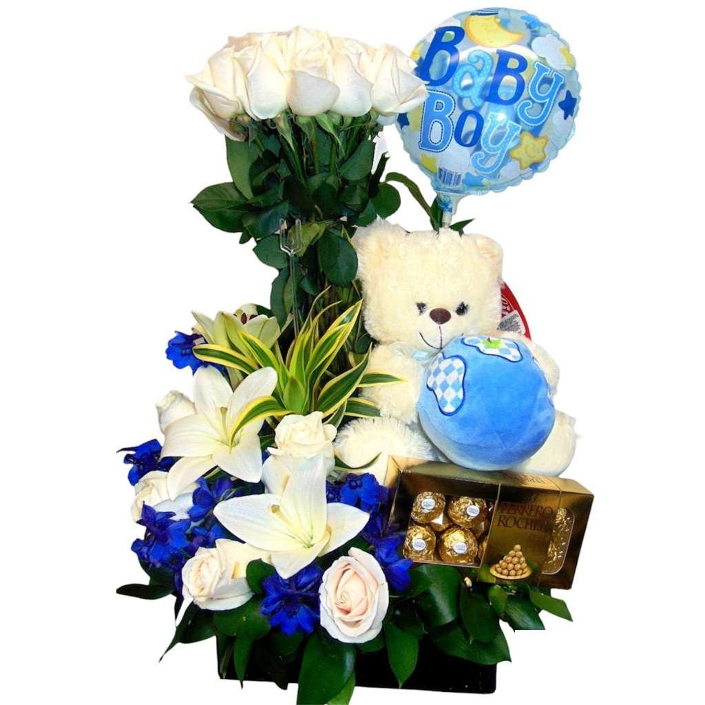 Arreglo de 24 rosas con lirios, bocas de dragón, peluche de 25 cm, ferrero x8 y globo, todo reunido en base de madera